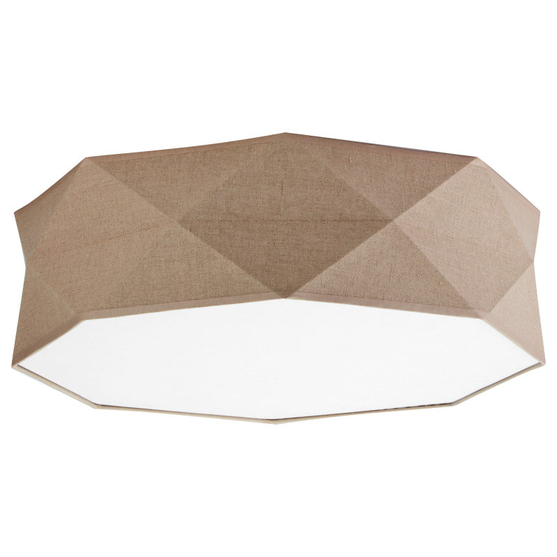 Elegantiškas plafonas, kuris sujungia lengvą audinio abažūrą su metaliniu pagrindu, skirtas gyvenamosioms ar reprezentacinėms patalpoms. Natūralios tekstūros ir geometrinės formos derinys suteikia interjerui jaukumo bei modernumo.