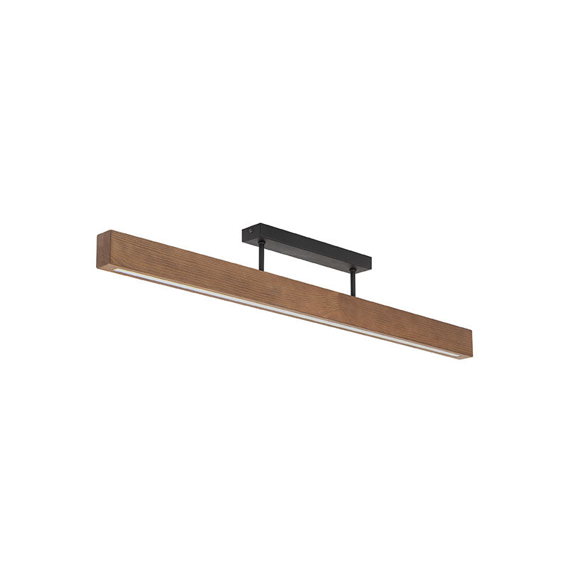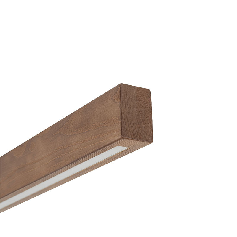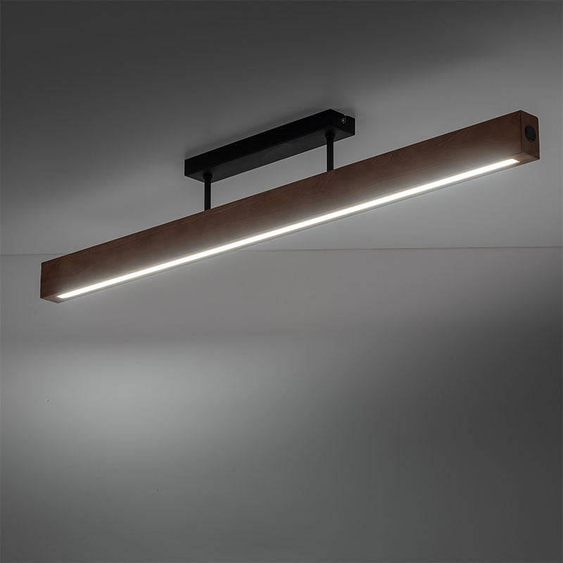 Modernus lubinis šviestuvas, kuriame kombinuojamos metalo apdaila ir medžio ar medžio imitacijos detalės, suteikiančios erdvei jaukumo ir natūralumo. Paprasta forma – ilgasis korpusas (~96 cm) – daro šviestuvą tinkamu pagrindiniam apšvietimui svetainėje, valgomojo zonoje ar virš salos.