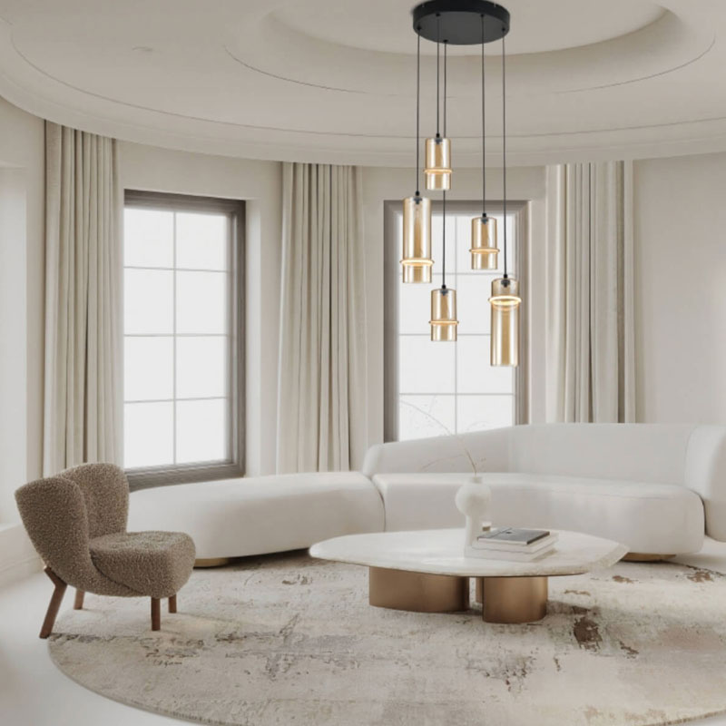 Šis elegantiškas pakabinamas LED šviestuvas sujungia šiuolaikišką dizainą ir funkcionalumą. „Champagne“ spalvos stikliniai gaubtai su juodais matiniais metaliniais akcentais sukuria rafinuotą ir šiltą atmosferą. Dėl savo dizaino ir šviesos kokybės, šis šviestuvas puikiai tinka tiek gyvenamosioms erdvėms, tiek biurams ar viešosioms patalpoms.